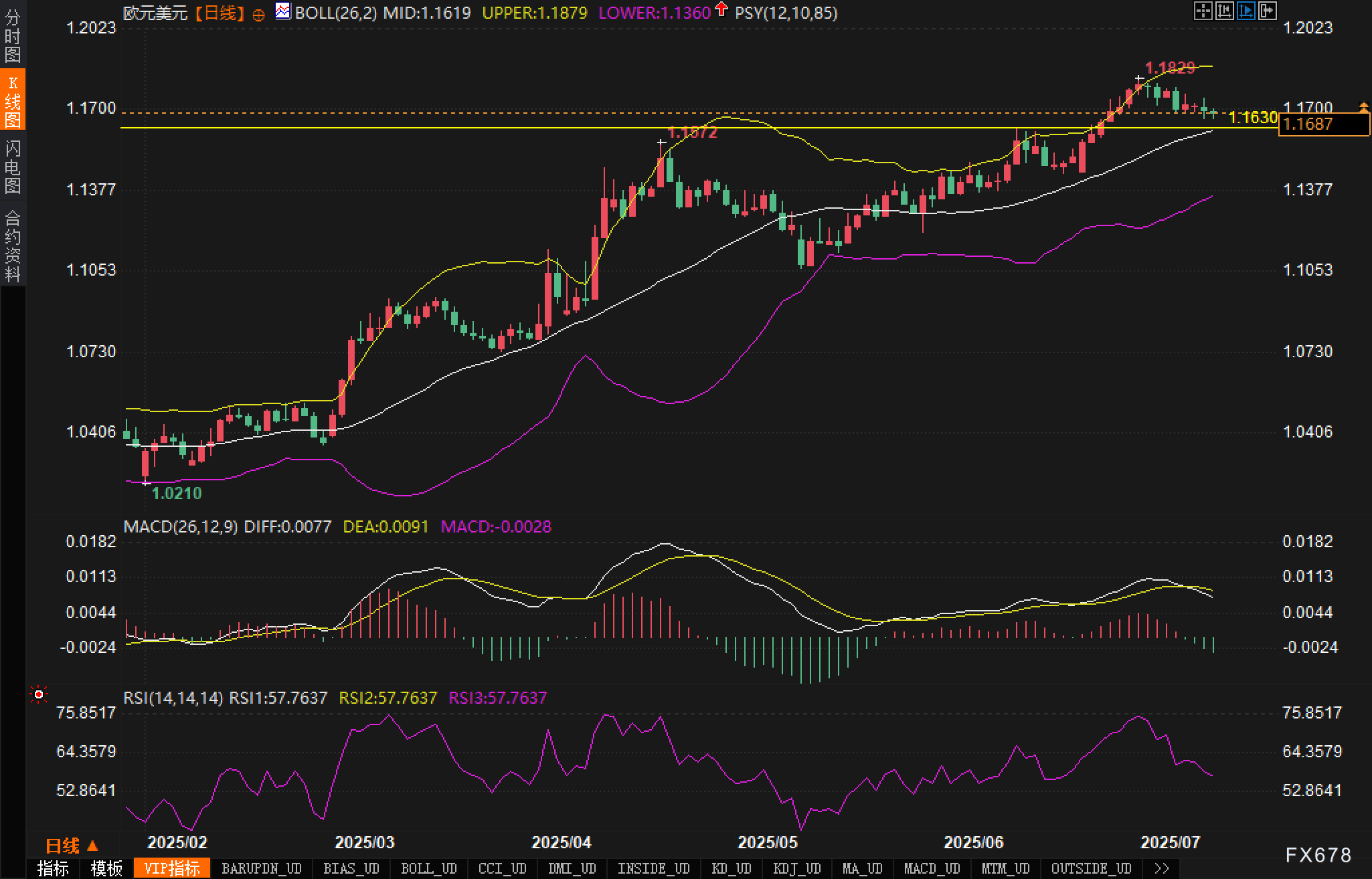 从K线图看,当前正在测试1.1630支撑区域,该区域同时靠近布林中轨,具有较强支撑属性。分析认为若失守,则下一支撑或见于1.1600整数关口;上方短期阻力参考昨日高点1.1750及布林上轨1.1879。