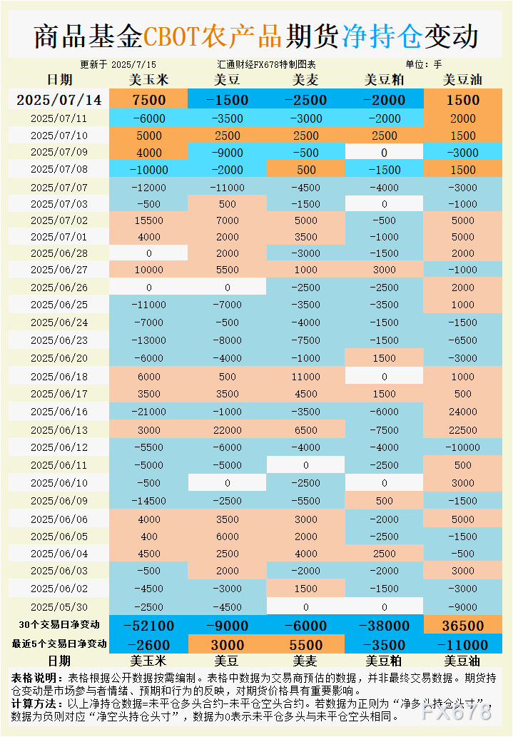 增加CBOT玉米投机性净空头;增加CBOT大豆投机性净多头;增加CBOT小麦投机性净多头;增加CBOT豆粕投机性净空头;增加CBOT豆油投机性净空头;