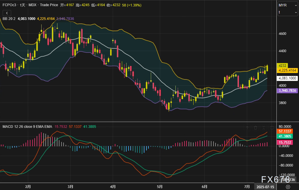 周一(7月14日),马来西亚衍生品交易所(BMD)棕榈油主力合约FCPOc3收报4232林吉特/吨,单日涨幅1.39%,创下近三周新高。日线级别布林通道中轨站稳4083林吉特支撑,MACD指标金叉初现,技术面呈现多头蓄势特征。此番上涨主要受三重因素驱动:国际原油价格走强、竞争油脂价格普涨,以及林吉特汇率疲软带来的出口价格优势。