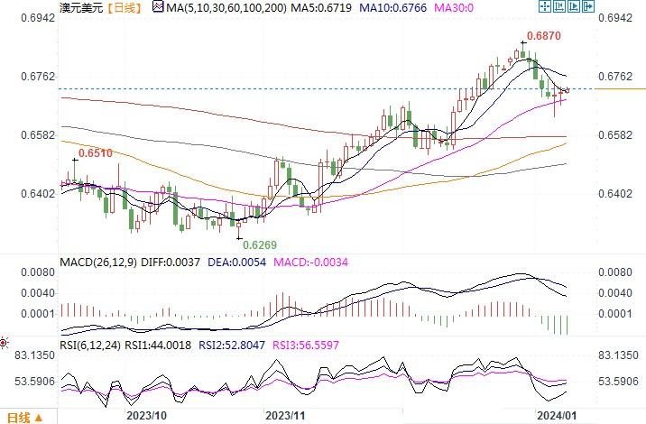 周一(1月8日),澳元兑美元变化不大,收盘价报0.6718基本与上周五持平。上周五,由于强于预期的美国非农就业数据使提前降息希望降低,导致风险资产抛售,上周五澳元遭受打击。但公布的服务业ISM调查意外疲软,就业率降至三年多来最低,这又帮助澳元扳回部分失地。利率期货预期明年美国的降息幅度约为134个基点,约为五次降息,而去年年底的预期是六次降息。海外市场的变化导致国内市场也预计澳洲央行今年将降息两次,这种预期概率是否升高,本周二和周三澳洲公布的零售销售和月度通胀数据情况将是关键。日线图上,澳元/美元短线呈超跌反弹走势,但回升幅度有限,且技术指标下摆的趋向未发生任何转向痕迹,显示澳元空头暂时占优。上方只有突破0.6770阻力,方有望延续上行的轨迹。否则澳元/美元仍存在不断下探低点的风险。