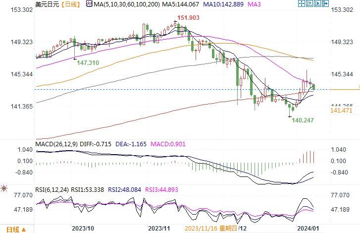 周一(1月8日),美元兑日元有所下跌,至收盘阶段跌0.35%,报144.10。上周五的非农就业报告可谓喜忧参半。整体读数无疑是相当高且不错的,但许多分项指标也显示出劳动力市场的一些领域的疲态更加严重。因此投资者继续消化上周喜忧参半的美国经济数据,并等待从本周关键的通胀数据中寻找美联储可能何时开始降息的新线索。根据芝商所(CME)的FedWatch工具,交易员目前认为3月降息的概率为64%,低于一周前认为的89%。今年,在欧美各主要央行都被预期降息之际,日本央行却有所不同,或将加息,使利率升至正值区域,但其利率很可能仍低于全球其他主要央行。在上周日本能登半岛西部发生7.6级地震后,加息时间也可能推迟。况且,由于此前日元的回升已提前对加息预期进行了消化,即便日本央行果真有加息举动,料对日元的刺激作用也不会太大。日线图上,美元/日元短线继续处在冲高回调之中,技术指标向上延摆趋向未变,显示美元多头暂时未有退去的迹象。继续留意下方143附近的支撑,若跌破,美元上升势头将发生逆转。不破,则存在继续升高的趋向。