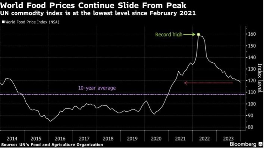 消费者有望看到一丝缓解。联合国的食品价格指数跟踪了五大主要出口原材料类别,去年下降了10%,目前已降至近三年来的最低水平。然而,食品通胀问题依然严重,该指数目前仍高于过去十年的平均水平,并且这些价格下降需要一段时间才能反映到超市的零售价格上。由于全球范围内的能源、劳动力和运输成本高企,超市价格仍然维持在较高水平。