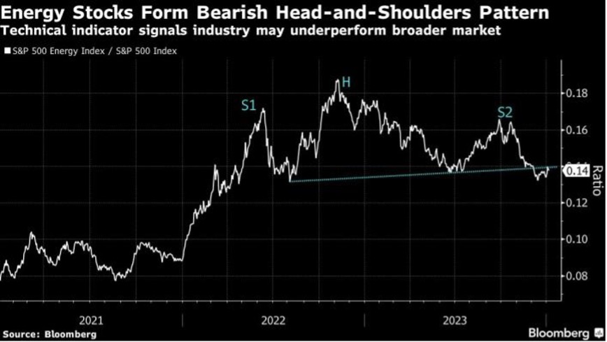 据彭博情报分析,从技术角度看,标普500能源指数未来持续低迷的可能性正日益增大。该指数与更广泛的标普500指数之间的比率已形成头肩顶形态,即在形成三个高点后(其中中间的高点H超过另外两个S1和S2),收盘价跌破了支撑位——即形态的颈线。这预示着可能的进一步下跌。若比率持续在颈线以下,则会一直维持这一看跌图形。此外,上个月该指数经历了所谓的“死亡交叉”(death cross),即其50日移动平均线跌破200日移动平均线。这个追踪包括埃克森美孚(Exxon Mobil Corp.)、雪佛龙(Chevron Corp.)和康菲石油(ConocoPhillips)在内的23家能源公司的指数,去年下跌了近5%,在2022年则曾飙升59%。