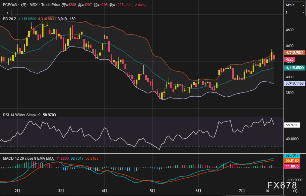 周一(7月21日),马来西亚衍生品交易所(BMD)棕榈油主力合约FCPOc3收于4226林吉特/吨,单日下跌89林吉特(2.06%),终结前一交易日反弹势头。技术指标显示,MACD柱状线收缩至11.88,RSI(14)回落至58.97,价格跌破布林通道中轨4115林吉特支撑,短期动能明显转弱。
