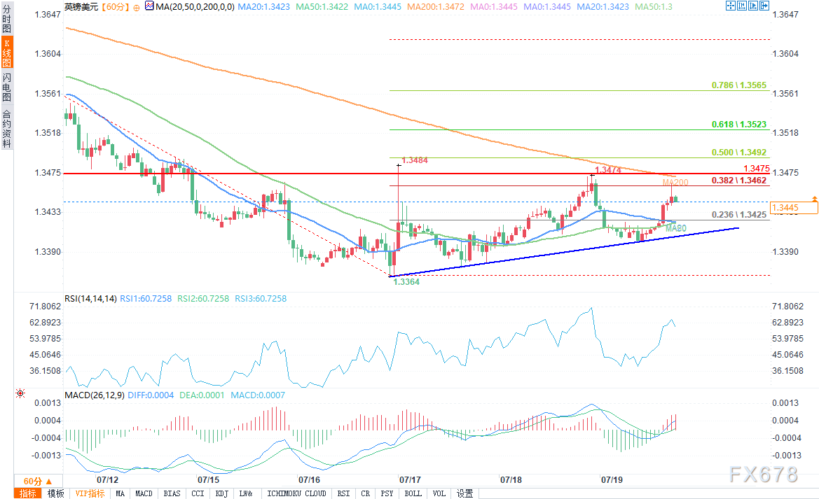 周一(7月21日)欧盘时段,英镑/美元分时图显示价格短期内经历了一波拉升后有所回调,价格最高触及1.3465附近,目前处于一个关键的震荡区域。