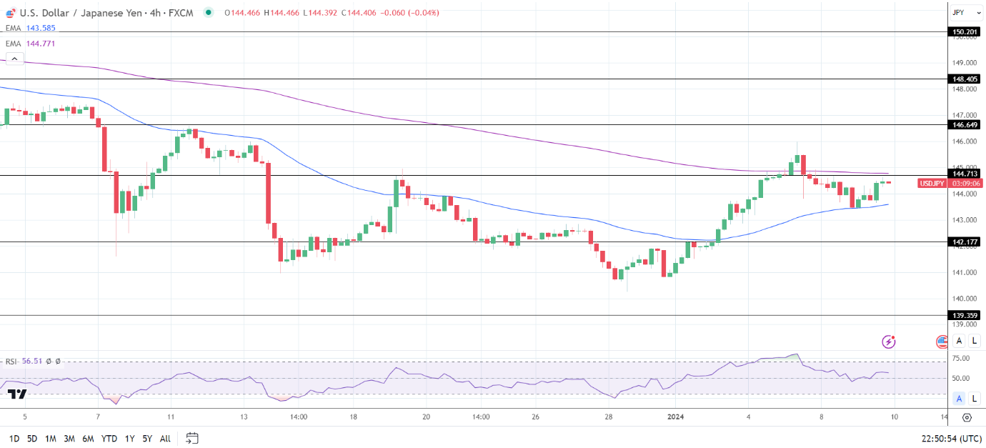 周三(1月10日)亚市,美元/日元短线冲高至144.82,多头挑战重回145整数关口。日本名义工资上涨0.2%,实际工资却下跌3%,意味着在“春斗”前数据不支持提早转向紧缩。交易员聚焦美联储官员晚些时候的讲话,这将暂时压制日本央行“黑天鹅”信号的定价。