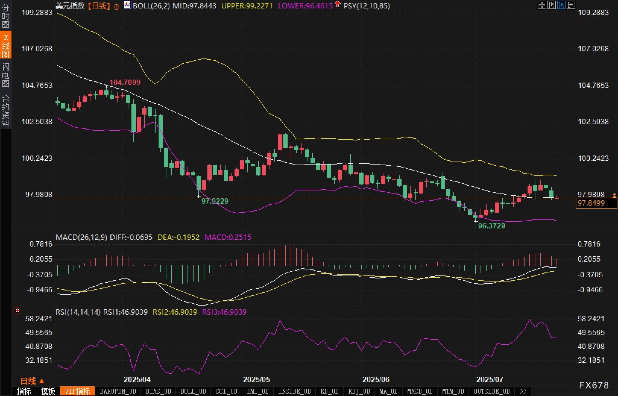 当前美元指数K线结构显示,自高点104.7099以来,整体维持“下降通道”格局,目前已运行至布林带中轨下方,短线偏弱。