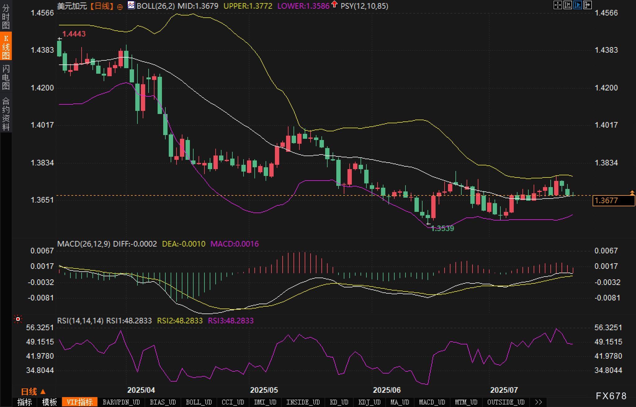 周二(7月22日),美元兑加元延续回撤势头,美市盘前汇价交投于1.3680附近。市场对美国关税政策可能冲击经济的担忧不断升温,美元承压。同时,加拿大经济数据表现尚可,但受制于国际原油价格疲弱,加元涨势受限。技术面显示布林中轨附近支撑正在接受考验,短线可能面临方向选择。