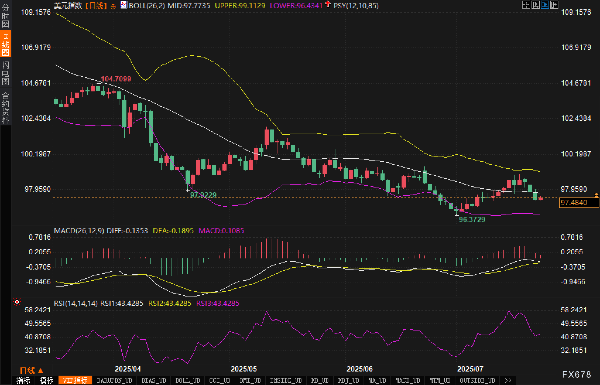从K线图观察,美元指数目前仍处于布林带中轨(97.77)下方震荡整理;当前处于布林带中下轨之间,略高于前低96.3729,但上方98关口构成较强阻力。