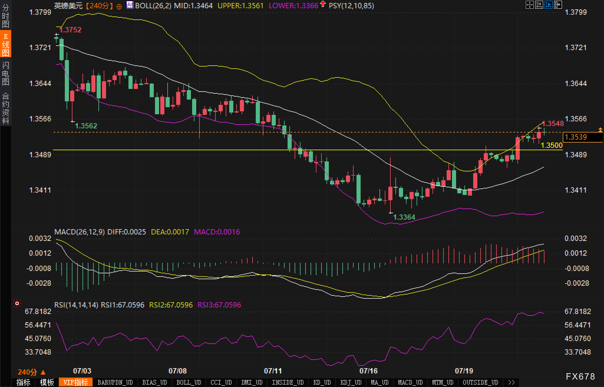 周三(7月23日),英镑兑美元(GBP/USD)延续反弹走势,日内最高触及1.3548,维持在布林带中轨上方震荡。尽管英国财政风险再度引发关注,但市场对于英国央行即将降息的预期与美元的弱势共同影响了英镑汇价。短期内,交易员将密切关注即将公布的英国与美国7月PMI初值数据,作为判断两国经济动能的重要依据。