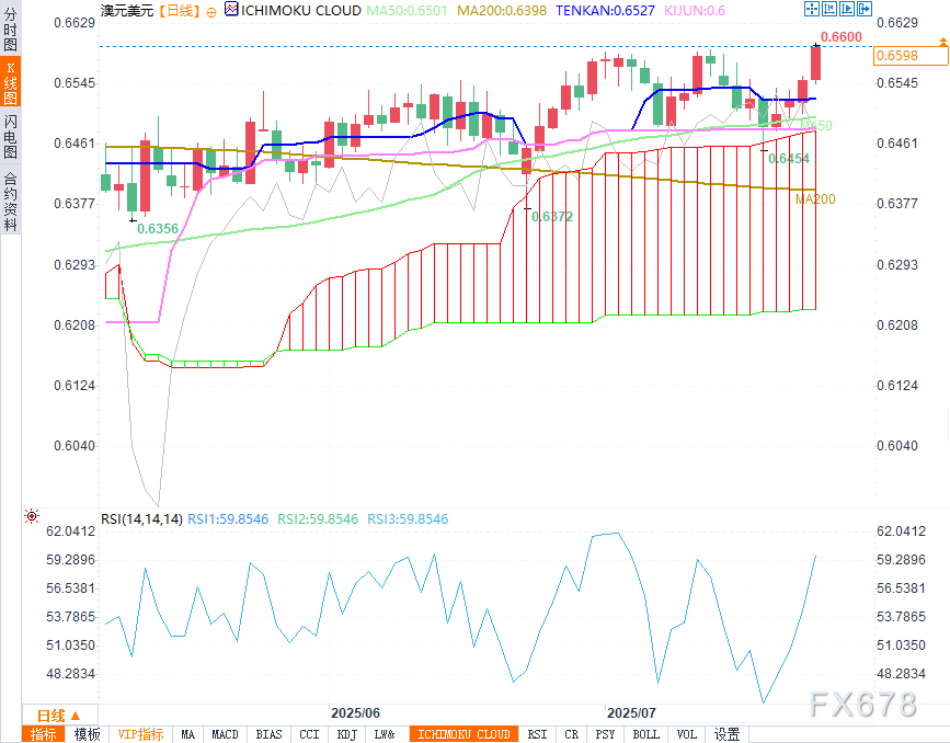 周三(7月23日),澳元对美元(AUD/USD)持续上涨,将连续上涨势头延续至第四个交易日。受美国总统特朗普宣布与日本达成重大关税协议(包括对日本出口商品征收15%关税)的推动,市场情绪改善,推动该货币对升值。此外,在8月12日截止日期临近之际,中美之间的谈判正逐步推进。