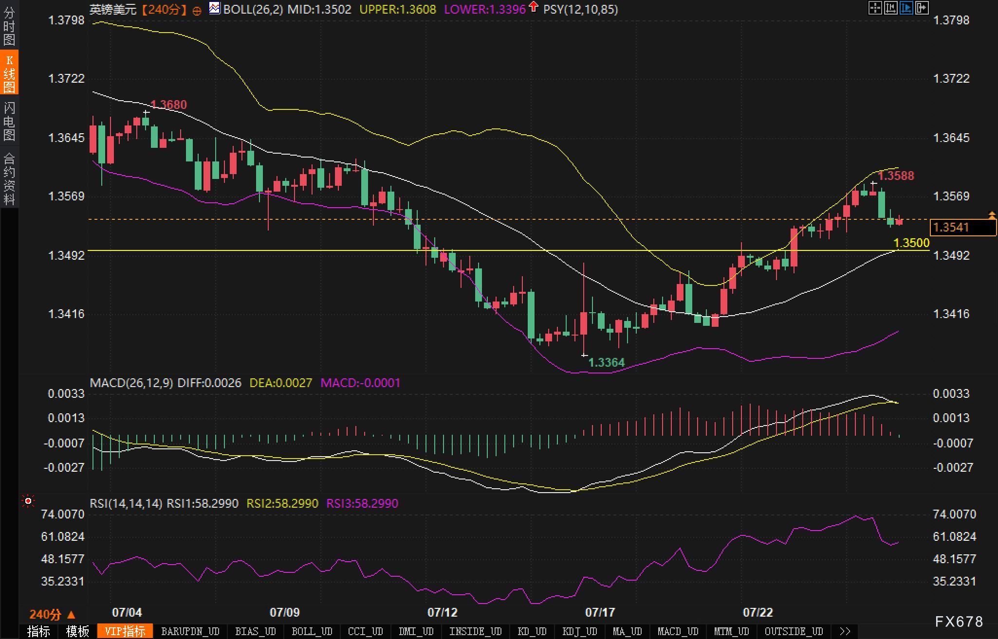 从英镑兑美元240分钟图观察,汇价自1.3364低点开启反弹行情,持续走高并一度触及1.3588高点,逼近布林带上轨(1.3608),随后承压回落。当前价格运行于布林带中上轨之间,短线有回测中轨(1.3502)动能,构成技术性修正格局。