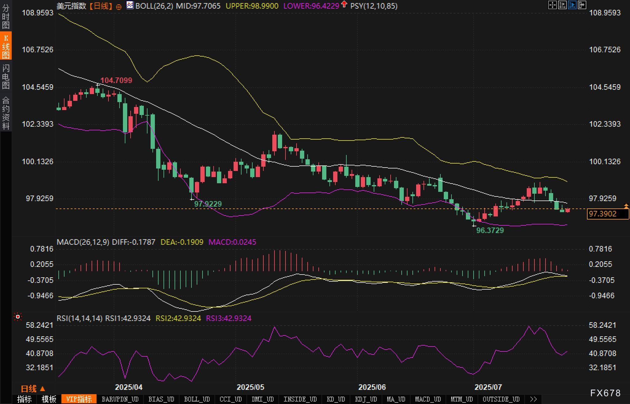 短线来看,美元指数已运行至布林带收敛末端,走势面临方向性选择。分析认为若7月PMI数据明显改善,美元指数有望突破98一线,打开上行空间;反之,若数据逊色,或将击穿96.42关键支撑,启动新一轮回撤;