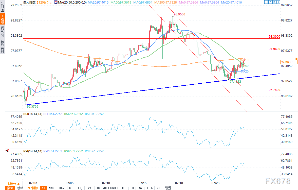 周五(7月25日),美元指数(DXY)稳定在97.55附近,连续第二日录得上涨。美元的强势表现主要受到强劲的美国经济数据以及对美日、美中贸易谈判乐观情绪的支撑。与此同时,市场对即将召开的联邦公开市场委员会(FOMC)会议以及潜在的降息预期保持高度关注。