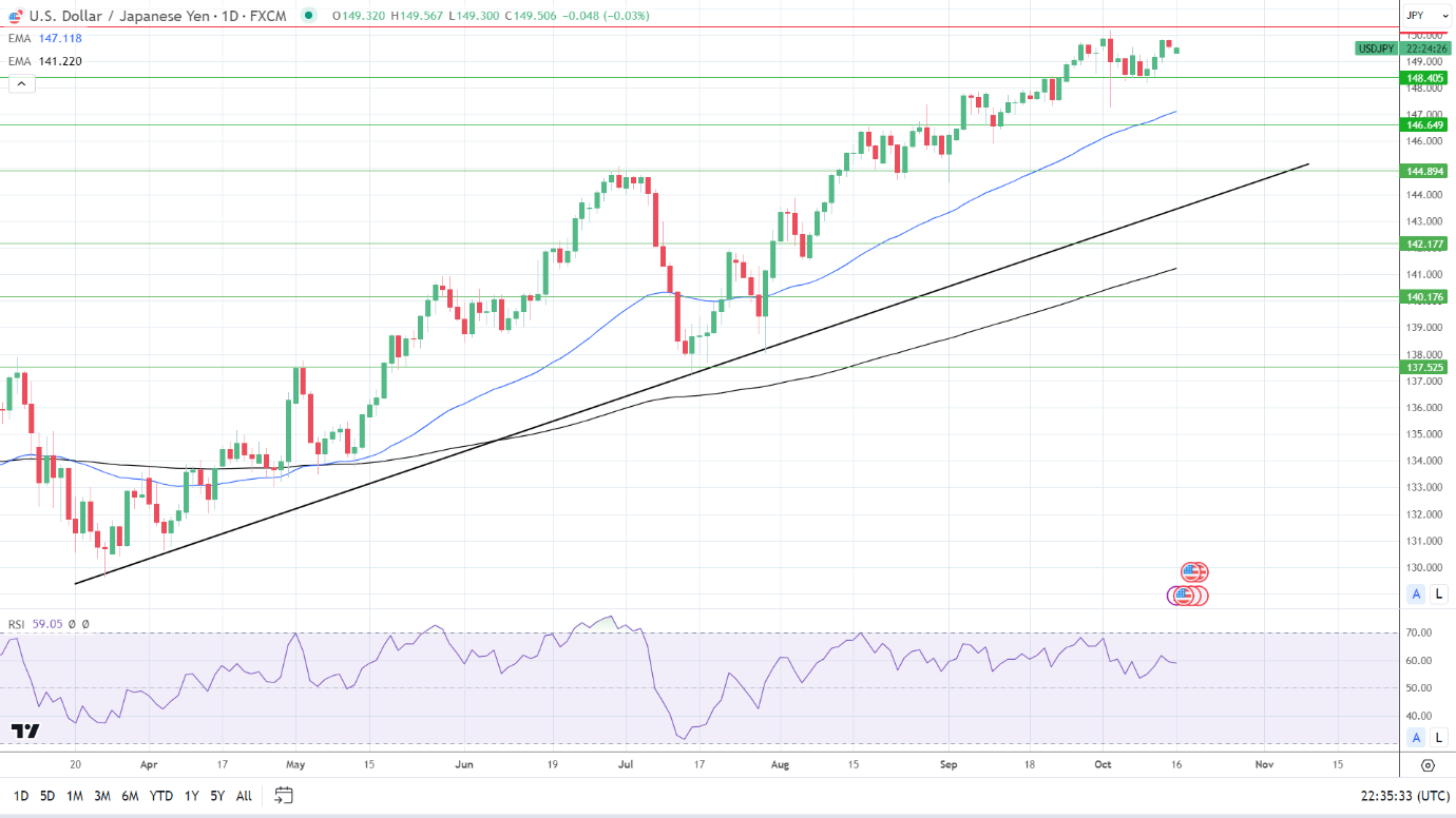 周一(10月16日)亚市早盘,美元/日元交投于149.50附近,难以坚定突破150大关,尽管技术分析展望,多头目标价望向151。美联储鹰派与日本央行鸽派的拉锯战持续发生,货币政策分歧仍然坚定地偏向美元。但是,巴以冲突和日元干预的威胁挥之不去,继续缓冲日元下行空间。市场风险情绪和鸽派的美联储言论,也正在测试买家对美元的兴趣。