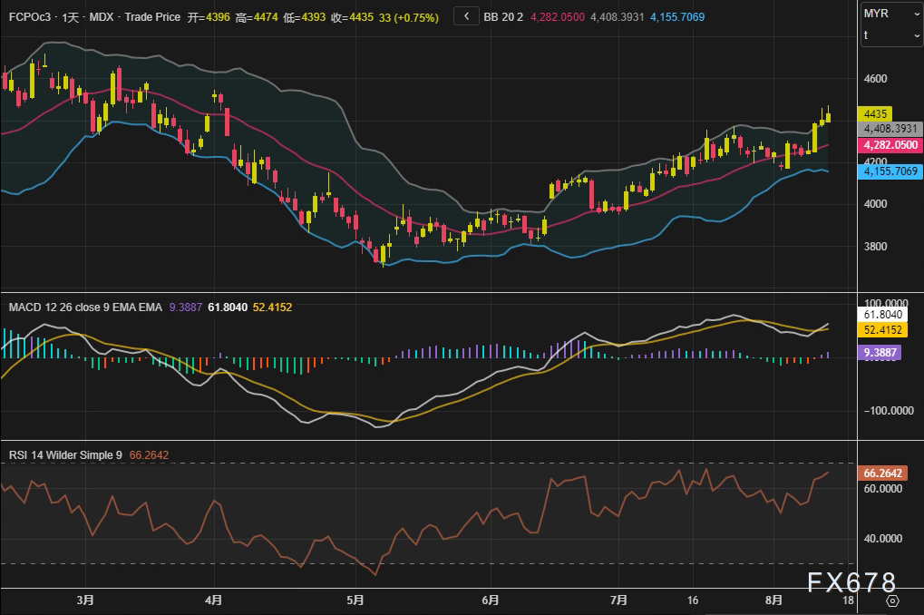 马来西亚衍生品交易所(BMD)棕榈油主力合约FCPOc3周三(8月13日)收报4435林吉特/吨,单日涨幅0.75%,实现四连阳。技术面显示,价格已突破布林通道中轨(4282林吉特),MACD柱状图收窄至9.39,RSI(14)升至66.26,短期动能偏强。本轮上涨的直接驱动力来自中国对加拿大菜籽加征反倾销税的政策冲击,连带推动大连商品交易所豆油(DBYcv1)与棕榈油(DCPcv1)合约分别上涨1.49%和1.4%。