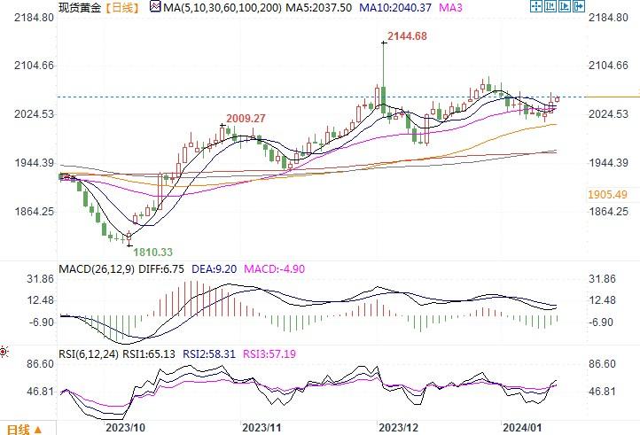周五美国劳工部统计局称,12月最终需求生产者价格指数(PPI)环比下降0.1%。11月数据修正后为下降0.1%,前值为持平。PPI已连续三个月下降。生产者商品价格回落表明,尽管消费者商品价格在连续两个月下降后于12月回升,但商品通缩的势头依然没有改变。这推动交易员增加了对未来几个月降息的押注。根据芝商所(CME)的FedWatch联邦观察工具显示,联邦基金利率期货市场目前预期3月降息的可能性为79%,高于周四预期的73%。为此,美国短期公债受益率出现下降,而黄金也是借机发力反弹回升。此外,地缘国金冲突事件升级也给到黄金额外避险买盘的理由。在胡塞武装连续数周在红海袭击船只、扰乱全球航运之后,美国和英国对也门胡塞武装的目标发动空袭,袭击雷达设施、储存地点和导弹发射装置。周四,也门胡塞武装领导人阿卜杜勒?马利克?胡塞警告说,美国针对胡塞武装发动的任何一次袭击都会得到胡塞武装的回应,而且未来胡塞武装的反击将更为猛烈。在美英打击胡塞武装目标之后,红海的紧张局势可能不仅不会停止,还会加剧。黄金或因此能继续凸显出避险方面的吸引力。