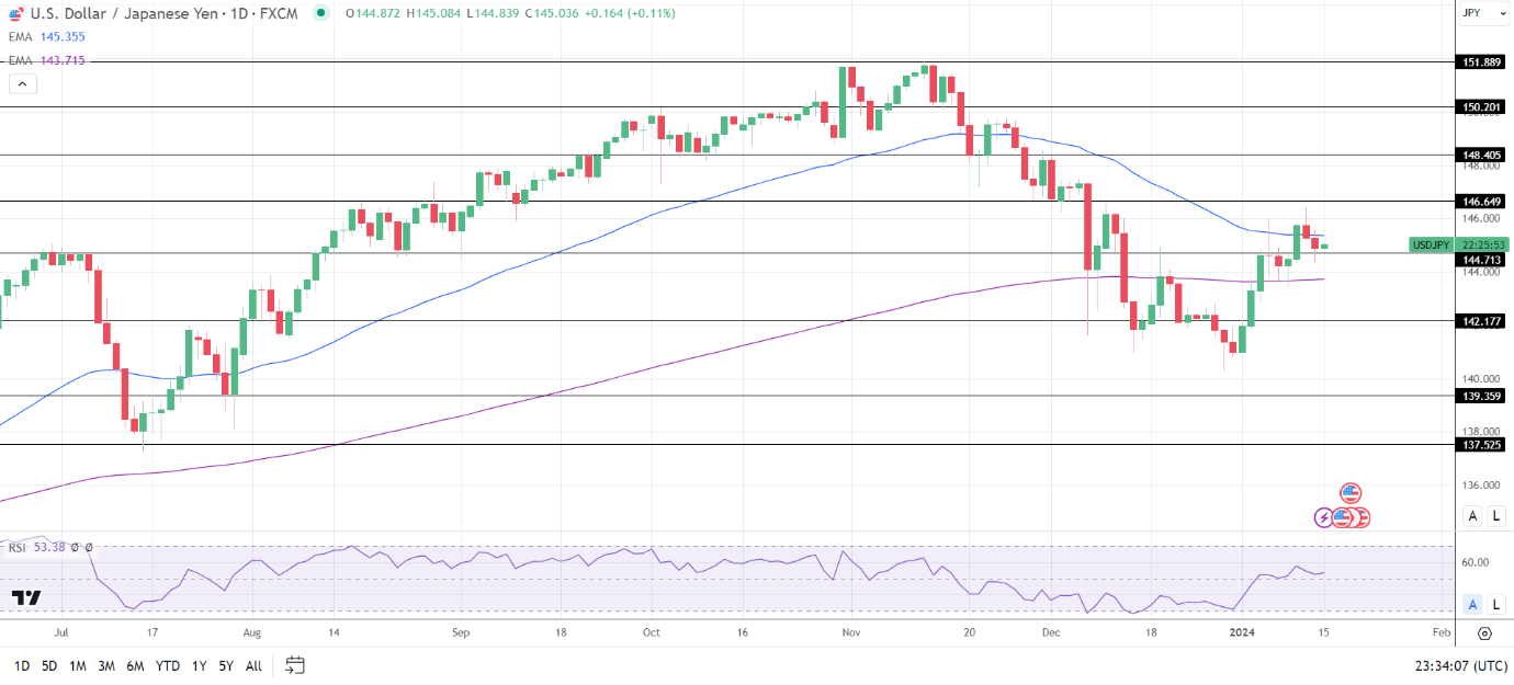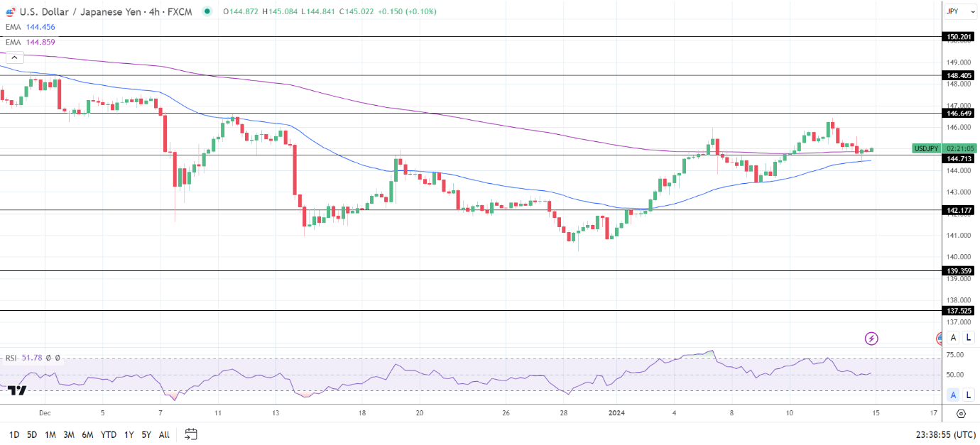 14周期4小时RSI为51.78,表明美元/日元在进入超买区域之前将升至146.649阻力位。