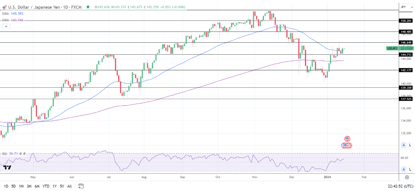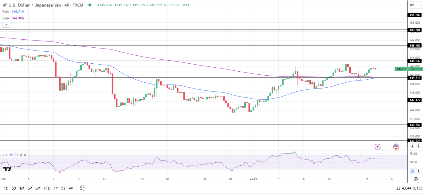 14周期4小时RSI为60.02,表明美元/日元在进入超买区域之前将回到146.649阻力位。
