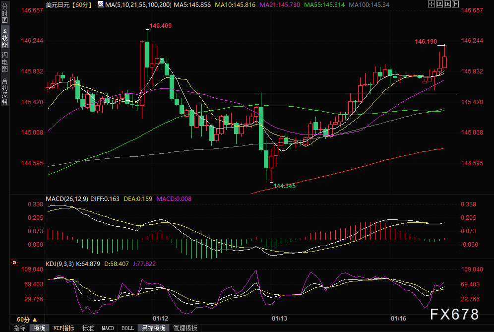 周二(1月16日)亚市,美元/日元短线突破146大关,最高触及146.19附近,目前小幅回落至146.06附近。汇市交易员对日本央行转向押注的缓解,以及美国零售销售数据上升押注,支撑着该货币对买盘。技术分析指出,美元/日元短线看涨趋势已确认,试图向147进发。