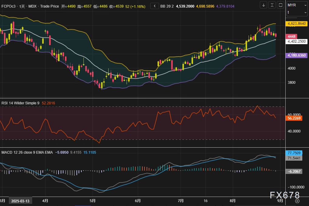 从技术指标看,棕榈油主力合约日线级别布林带(20,2)中轨位于4539林吉特,价格目前运行于中轨下方;MACD(12,26,9)虽仍处于负值区间(-5.6950),但快慢线差值收窄,显示下跌动能减弱;RSI(14)为52.28,处于中性区间,表明市场暂未进入超买或超卖状态。整体技术结构指向短期震荡整理。
