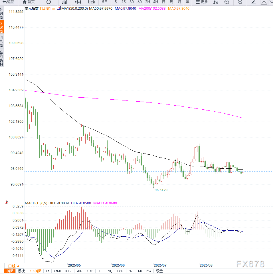 技术指标方面,RSI徘徊在40附近,显示动能偏弱,MACD仍在零轴下方,暗示美元指数反弹力度有限,趋势依旧偏空。