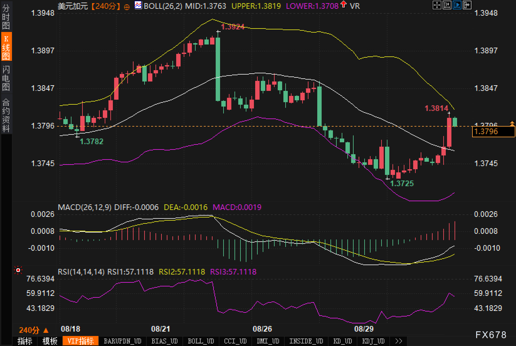 价位结构上,1.3782与1.3725构成近期上移的抬高低点组合;若上破1.3819并有效站稳,中期目标或指向前高区间与轴线刻度带(1.3850—1.39区间)。相反,若回落跌破1.3763并二次回测失败,易向1.3744(当日低点)—1.3708(布林下轨)寻求支撑带。综合趋势线、布林通道与动量指标共振,结论为:短线偏多、节奏以台阶式反弹为主;突破确认前仍属区间内上沿博弈。