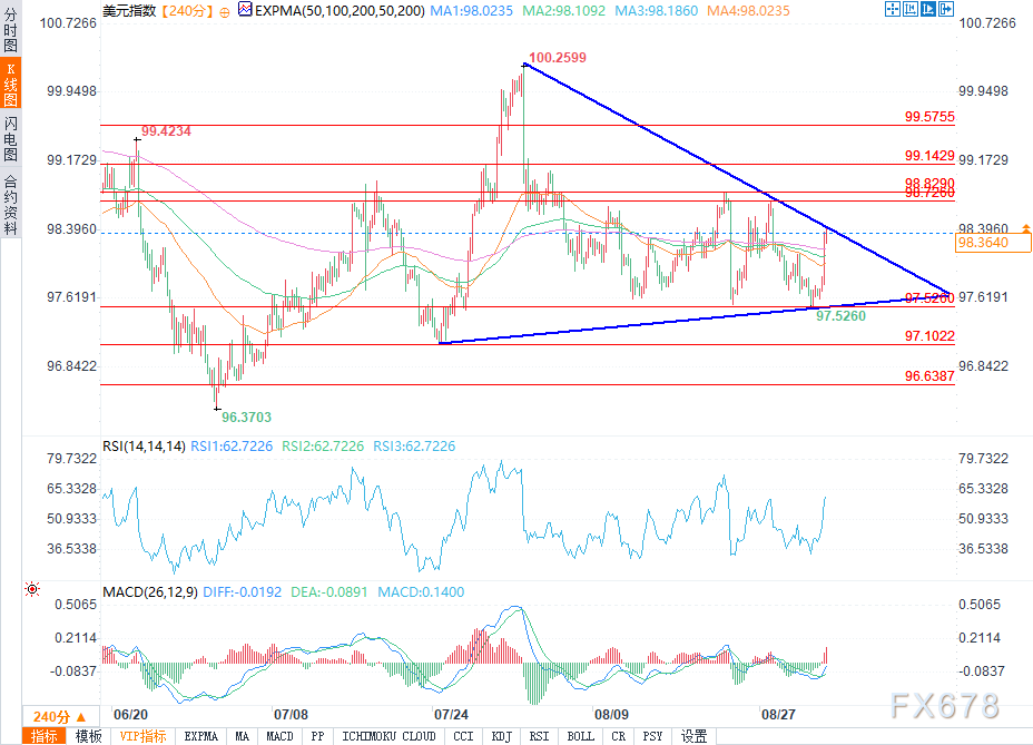 周二(9月2日)欧洲交易时段,美元指数(DXY)盘中小幅走高,升至98.37附近,涨幅约0.71%。