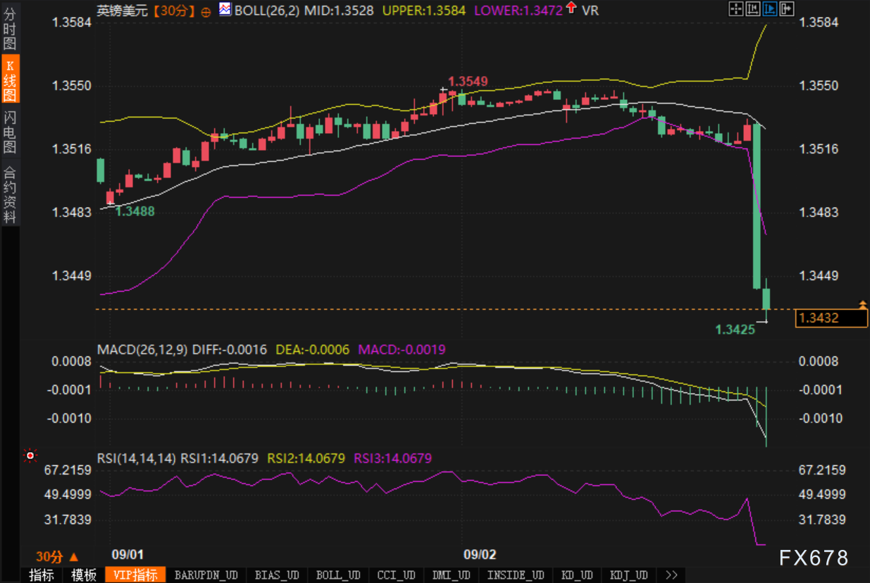 从30分钟K线图观察,布林带呈现“先收窄、后扩张”的带宽变化,中轨报1.3528,上轨1.3584,下轨1.3472。汇价在1.3549一线曾多次触抵上轨未能放量突破,随后一根长实体下行K线直接贯穿中轨并击穿下轨,最低探至1.3425,当前回到1.3430附近。MACD显示DIFF为-0.0016、DEA为-0.0006、柱状图-0.0019,空方动能处于扩张阶段,DIFF显著位于DEA下方,零轴下方的“死叉延续”尚未出现钝化迹象。RSI(14)读数仅14.0679,进入极端超卖区间,提示短线存在技术性反弹或“死猫跳”的时间窗口,但在布林带口径扩张的背景下,均值回归的斜率可能偏缓。