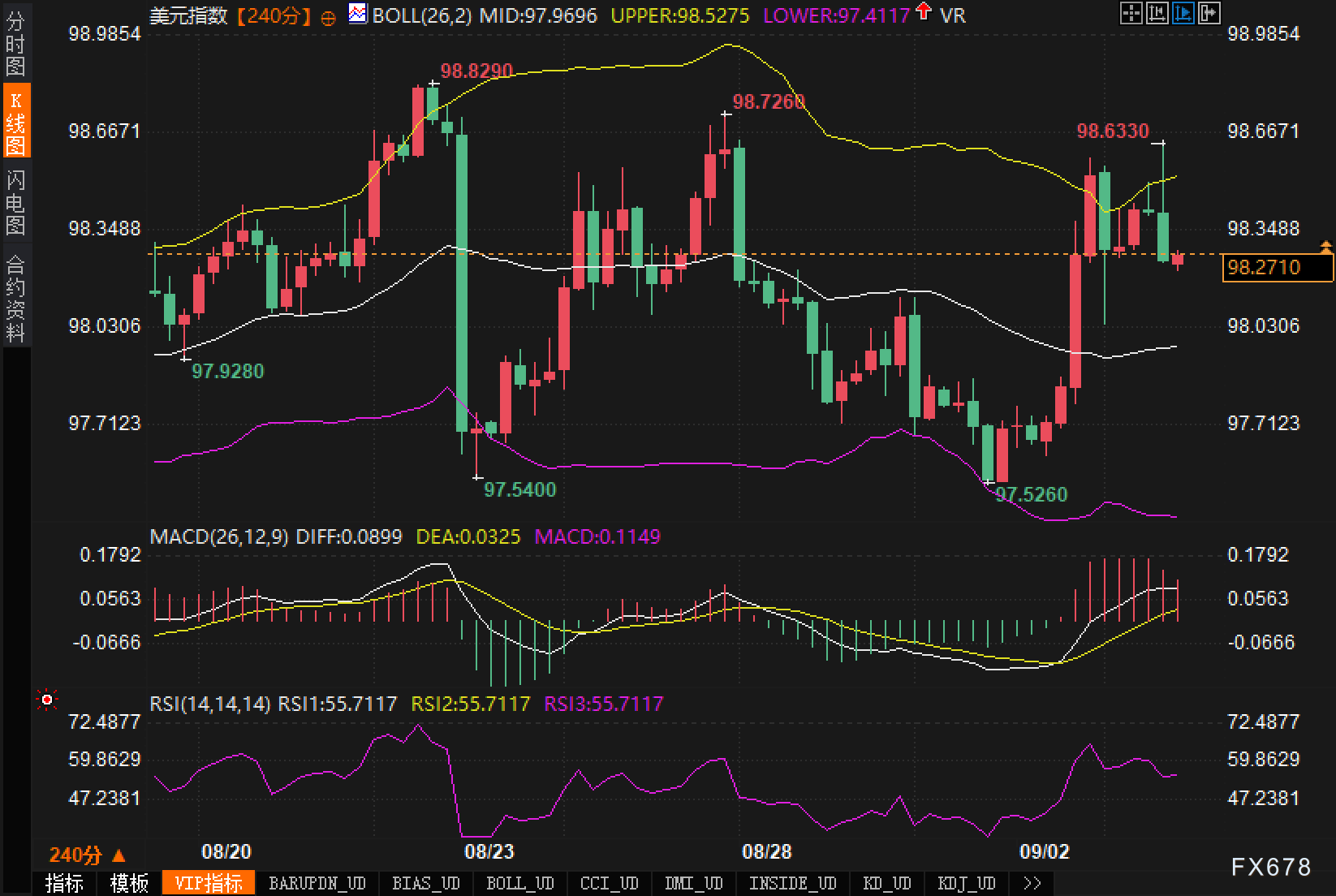 周三(9月3日)欧洲时段,美元指数(DXY)围绕98.20附近整理,受压于近两日高点。隔夜全球长端债券再度波动,美元短线走强后回吐。数据端,本周压轴的就业与通胀联动线索密集:今晚发布的JOLTS(7月职位空缺、离职与裁员),之后有ADP、ISM服务业与初请,周五迎来8月非农。