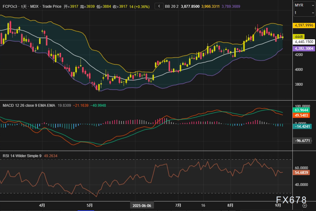 从技术分析角度看,棕榈油合约日线级别的布林带(20,2)中轨位于3877.85林吉特,价格目前运行于中轨上方,但上轨3966.33附近存在阻力。MACD指标(12,26,9)虽为正值,但柱状图收缩至-40.99,显示上涨动能有所减弱。RSI(14)读数49.26,接近中性区间,表明市场暂未出现明显超买或超卖信号。