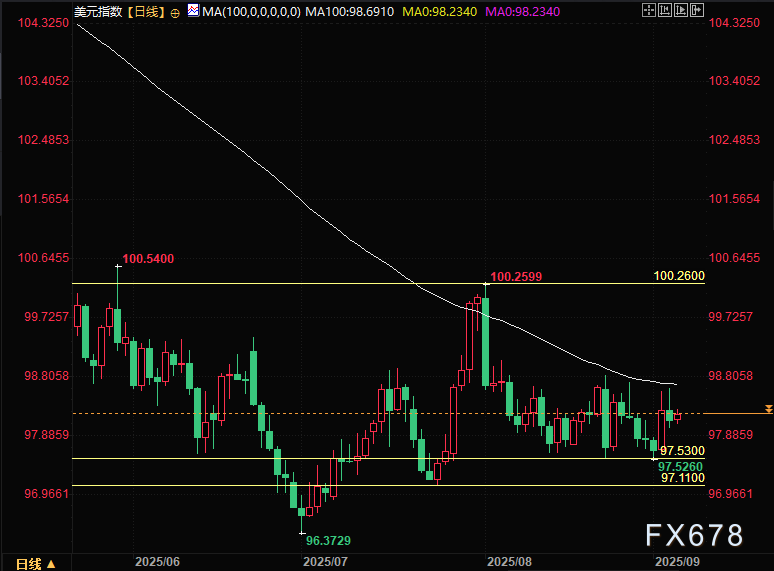 尽管美元指数(DXY)近期从四周低点97.53反弹,但目前仍徘徊在98.20附近,远低于7月就业数据公布前的水平,显示市场对美元的看空情绪尚未完全消散。