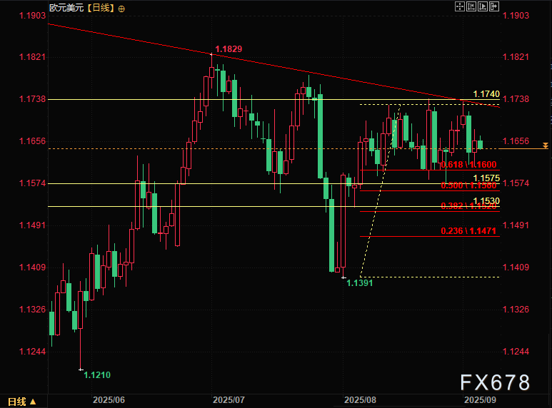 下行方面,阿尔卡拉着重强调了1.1575上方的支撑区域,他分析道:“欧元空头可能在月度区间底部1.1575-1.1590遭遇重大支撑,该区域曾在8月11日、22日和27日三次成功抵御空头攻势,显示出较强的买盘支撑。若进一步下跌,8月初涨势的50%斐波那契回撤位1.1560可能提供缓冲,其后关键支撑参考8月5日低点1.1530附近。只有跌破该水平,才可能开启更深度的回调行情。”