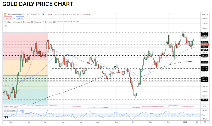 DailyFX高级策略师Nick Cawley表示,黄金的技术前景仍然乐观。来自50日简单移动平均线2,020美元/盎司的支撑。之前的波动高点为2,009美元/盎司。至少在短期内,应该会阻止进一步的抛售。贵金属的上涨将在2,043美元/盎司处遇到阻力。