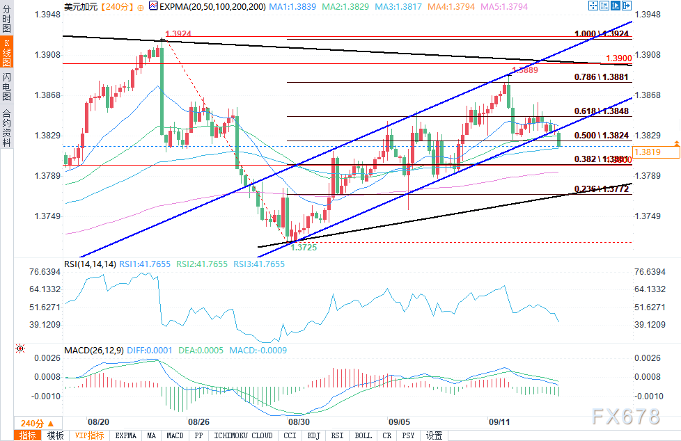 若跌势逆转,价格将重回到通道内部。若多头重新发力,将推动价格上破1.3889阻力位。