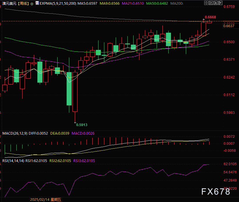 尽管短期看涨结构明确,但多头需重点关注0.6652关键关口——200周简单移动平均线(SMA)与指数移动平均线(EMA)在此处交汇叠加,大概率构成短期关键阻力。后续任何回调幅度大概率不会太深,市场买盘或将择机逢低介入,推动澳元兑美元向周线级别成交量密集区逐步靠近。