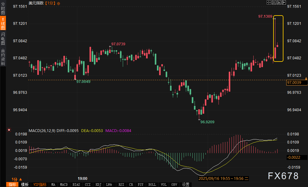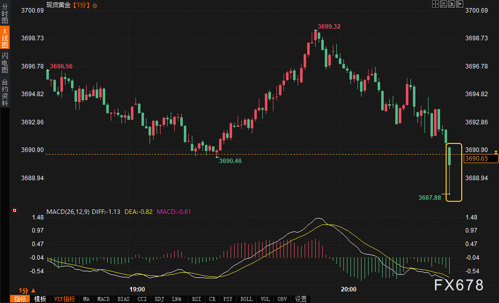 数据落地后,美元指数短线急升8点至97.1309,黄金则下挫3.5美元至3687.88美元/盎司,反映消费韧性对降息预期的微妙冲击。