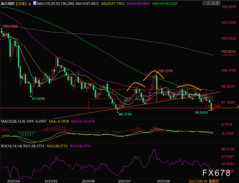 从日线图来看,美元指数已经明确跌破了头肩顶形态,同时跌破箱体,美元指数正在进行跌破箱体后的反弹,目前支撑在96.37为7月1日底点也是年内低点,之后如果跌破,则下看95.00关口,整体头肩顶形态量度跌幅在94.44。