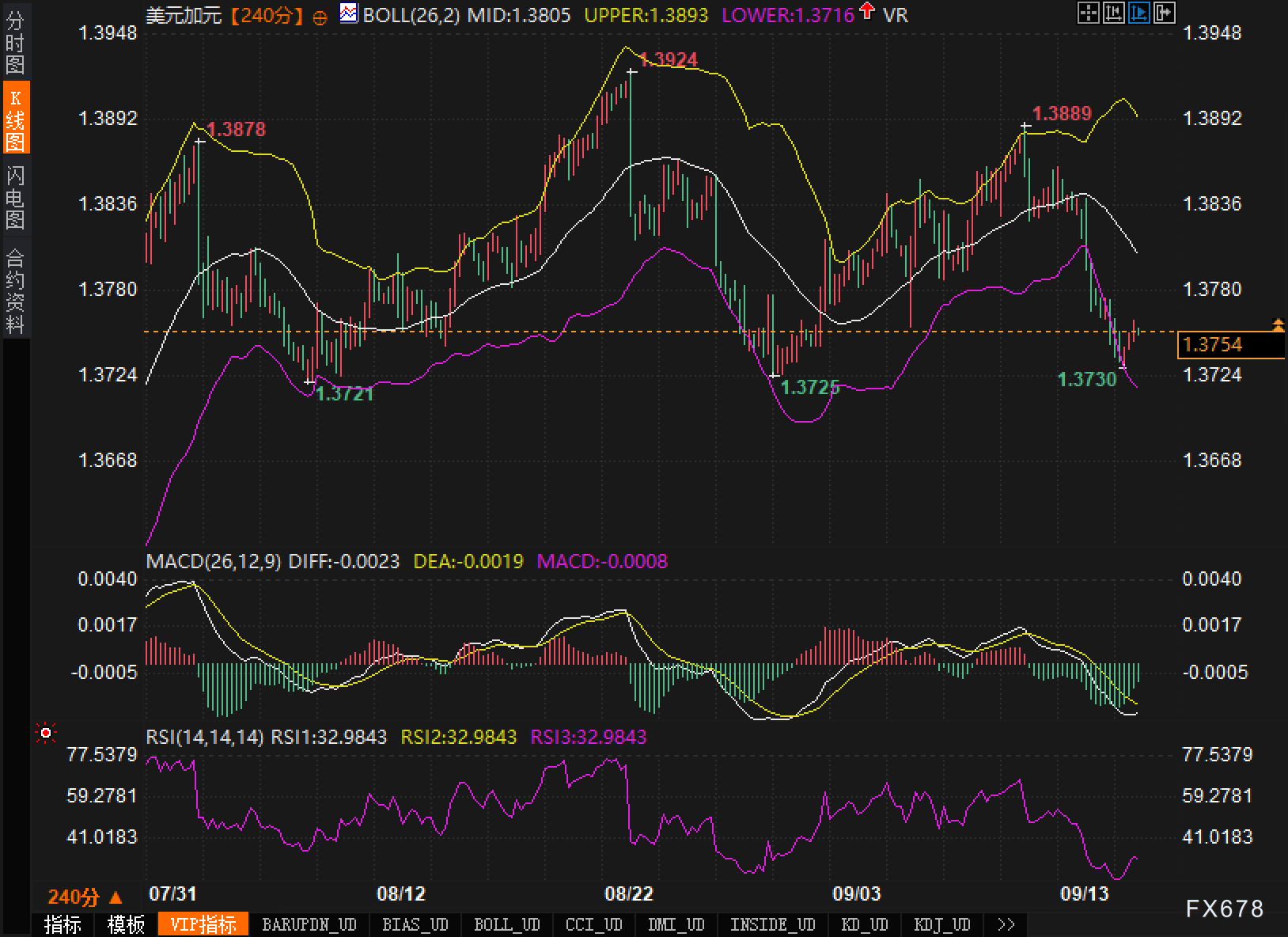 MACD显示:DIFF为-0.0023,DEA为-0.0019,均位于零轴下方且DIFF略低于DEA,柱状图为-0.0008,动能偏空且仍在释放,趋势延续占优。RSI(14)读数32.9843,逼近但尚未触及传统30的超卖阈值,提示“弱势并未极端化”。阻力方面,1.3805的布林中轨为首要上行考验,若重返其上,方可谈及对1.3878/1.3889与上轨1.3893、并上探前高1.3924的二次确认;若失守1.3725—1.3716支撑带,偏空节奏可能加速,心理关口1.3700将成为下一层级观察位。