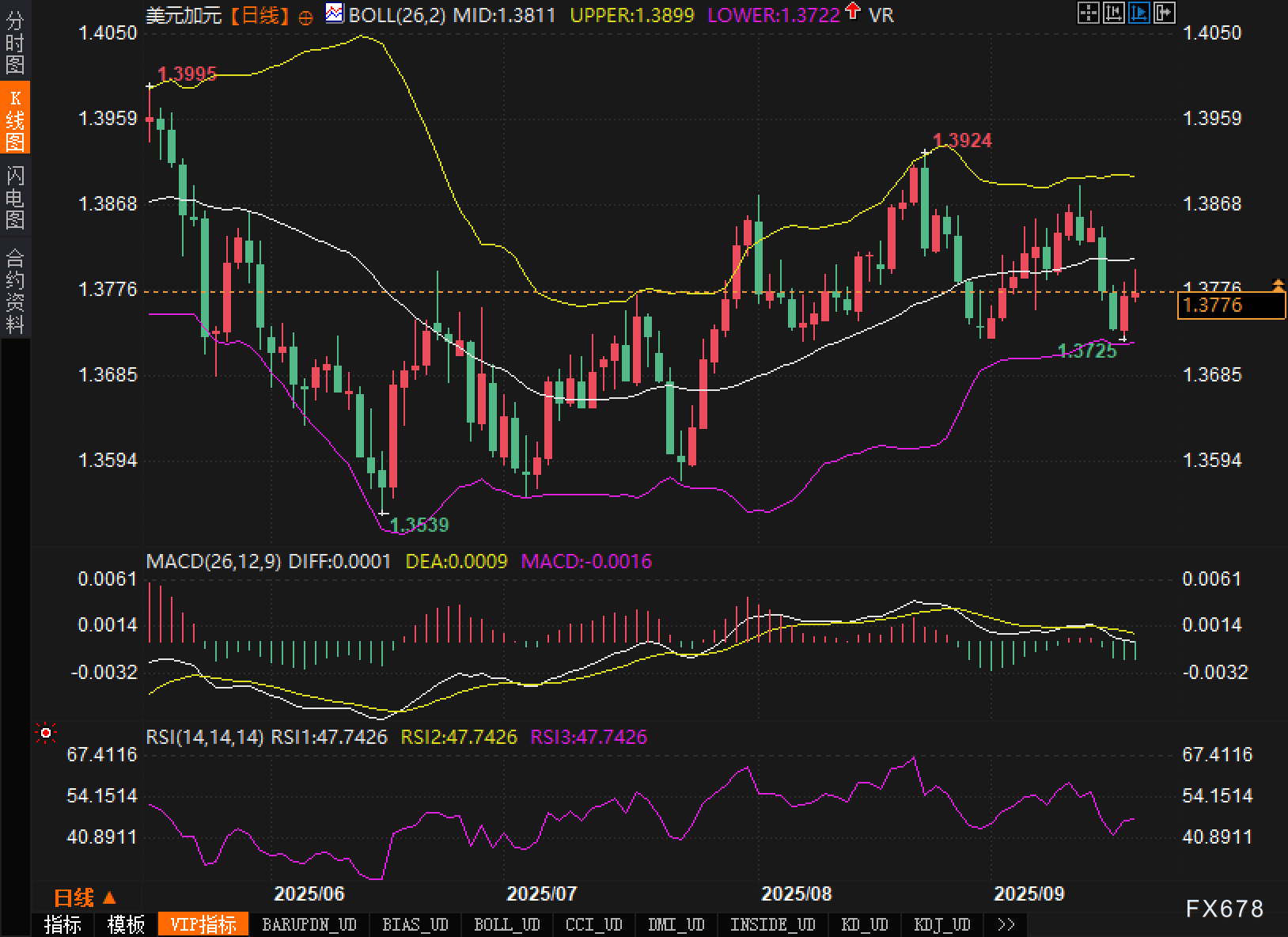 价格结构上,近期上探1.3924未果后回撤,最低回踩至1.3725一线,与下轨1.3722形成动态+静态共振支撑;更早前在1.3539构筑的阶段性低点,定义了今年6月以来的上行通道底边。若以1.3720~1.3900划定箱体,当前点位位于箱体偏下四分位,显示多空双方在“下沿之上、均线之下”的拉锯。