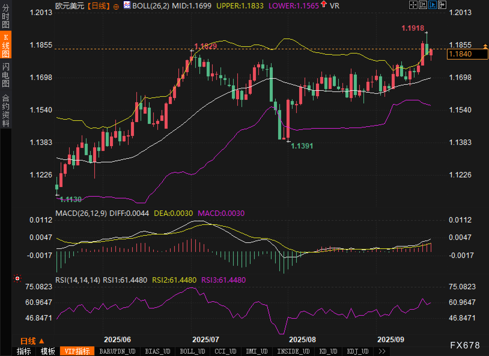 从日线图看,当前布林中轨在1.1699,上轨在1.1833,下轨在1.1565。汇价已越过上轨并在其上方缩量横向消化,短线构成“沿上轨走高”形态,显示上行趋势延续与波动率扩张同步出现。