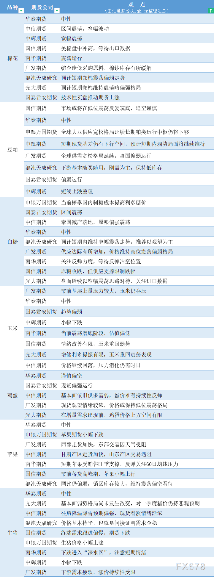 期货公司观点汇总一张图:1月18日农产品(棉花、豆粕、白糖、玉米、鸡蛋、生猪等)