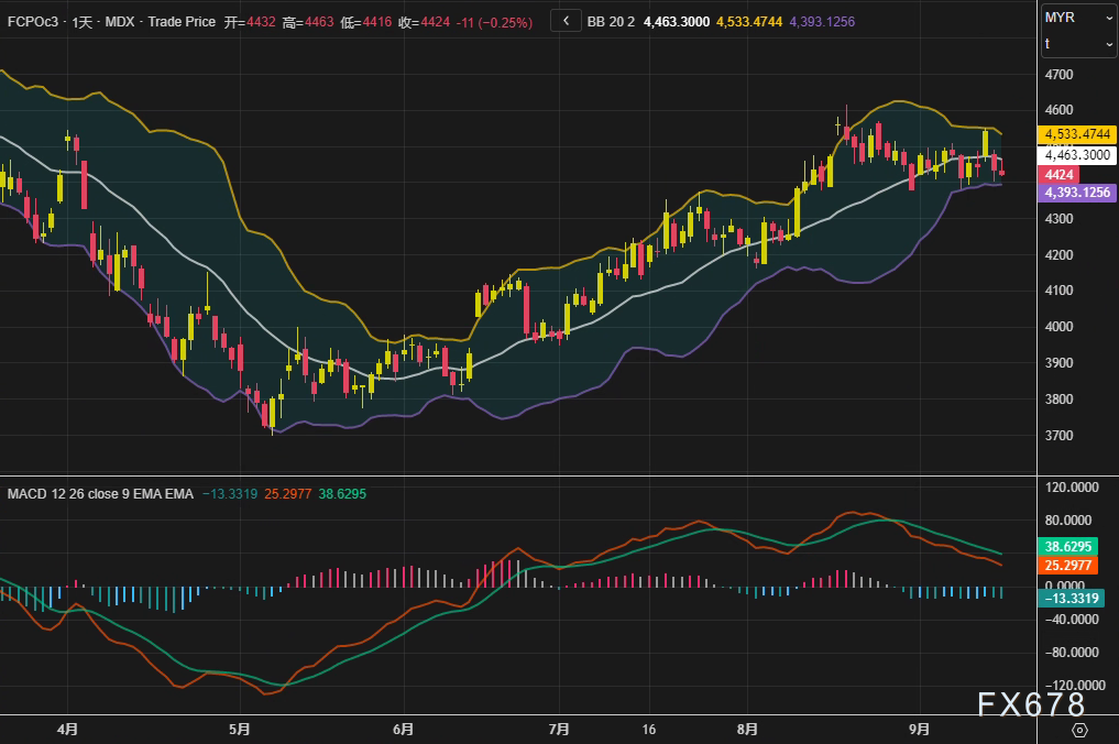 技术面上,棕榈油主力合约日线布林带中轨位于4463林吉特附近,MACD指标虽处于零轴上方但动能减弱,暗示短期调整可能延续。不过,也有观点认为,若原油市场因美联储利率政策调整后出现反弹,或带动棕榈油生物柴油需求预期重燃。