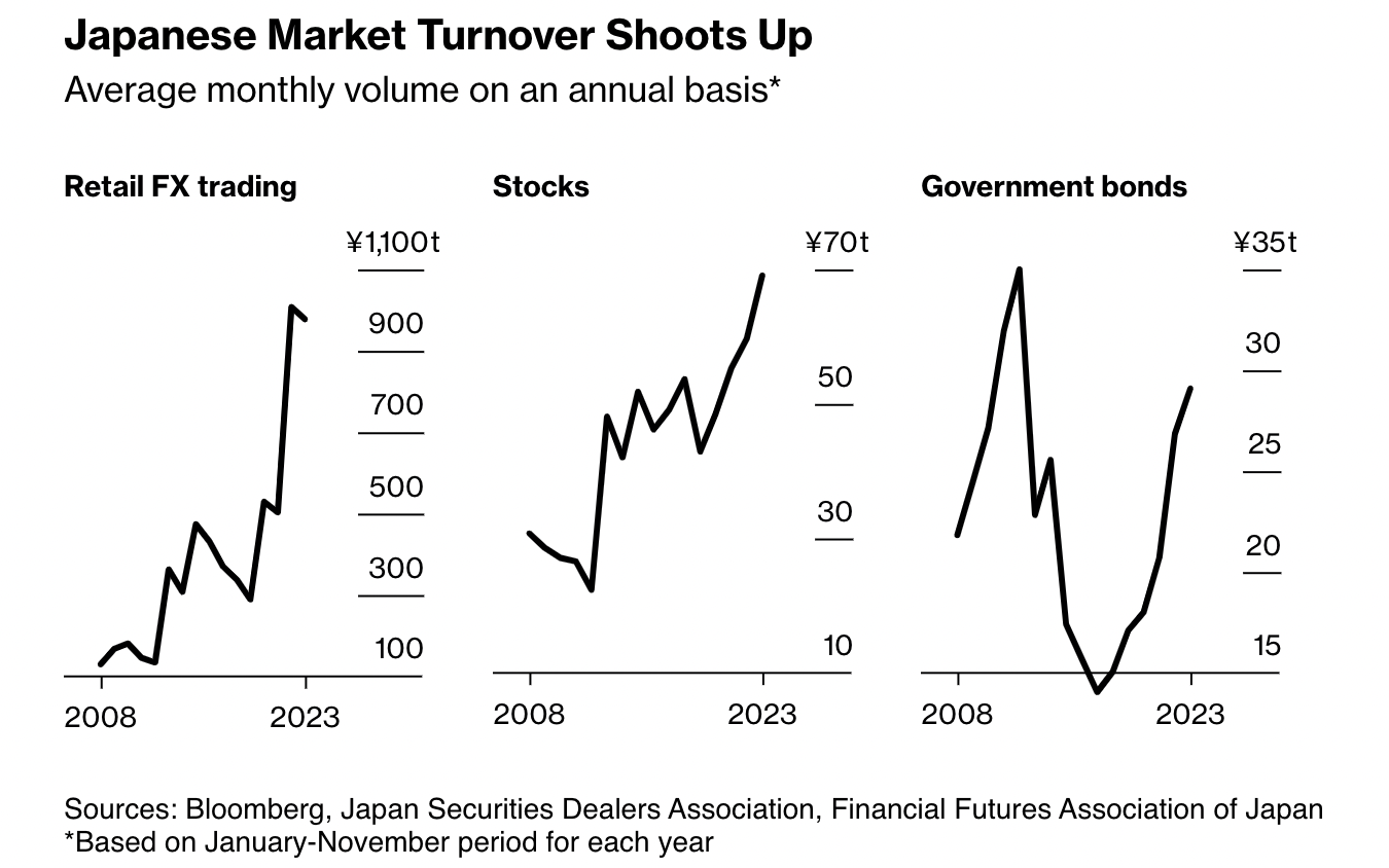 (日本市场营业额飙升,来源:彭博社、日本证券商协会、日本金融期货协会)