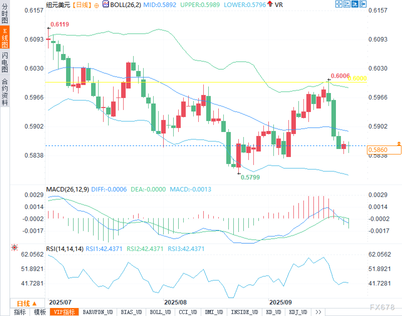 日线图显示,布林带中轨0.5892、上轨0.5989、下轨0.5796。汇价当前位于中轨之下、下轨之上,处于带内下半区间,反映短线仍为“下行后震荡”的结构。上方0.6000为显著心理关口,构成第一重阻力;更上方0.6119为阶段性高点,对应更强的历史抛压带。下方支撑则落在布林下轨0.5796与近端低点0.5799的“窄区共振”,若跌破,布林带可能由“走平”转向“下扩散”,触发新一轮顺势回落。