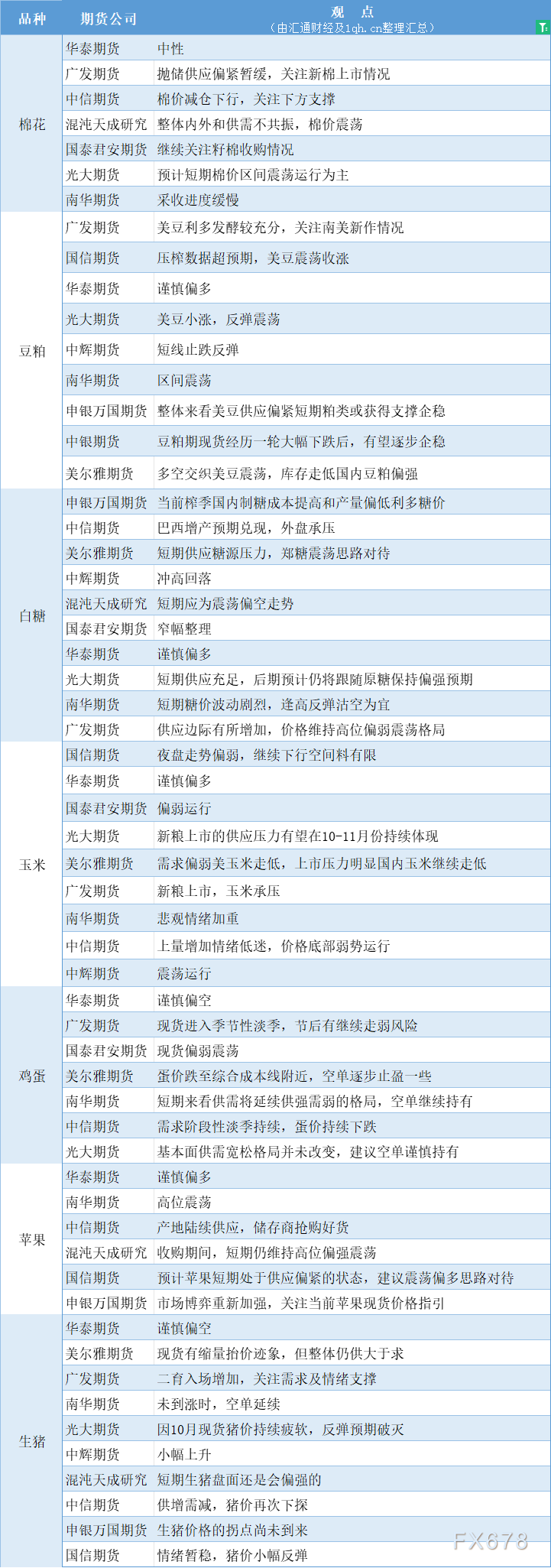 期货公司观点汇总一张图:10月17日农产品(棉花、豆粕、白糖、玉米、鸡蛋、生猪等)