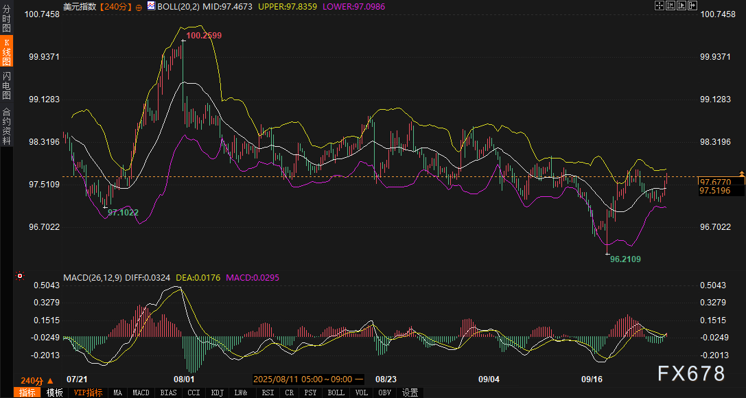 美元指数的240分钟图显示,自8月初冲顶后进入长达一个多月的震荡下行,9月16日低点96.2109后迅速拉升,目前报价97.6799,累计反弹逾1.4%。这一轮上行动能得益于MACD金叉的确认,DIFF线0.0322和DEA线0.0176均站上零轴,柱状图放大至0.0291,短期多头结构清晰。价格已有效突破布林带中轨97.4674,正向97.8372上轨发起冲击,这与美债收益率的同步回暖形成紧密联动:收益率的企稳往往放大资金回流美元资产的吸引力,尤其在美联储政策预期从鸽派转向中性的背景下。