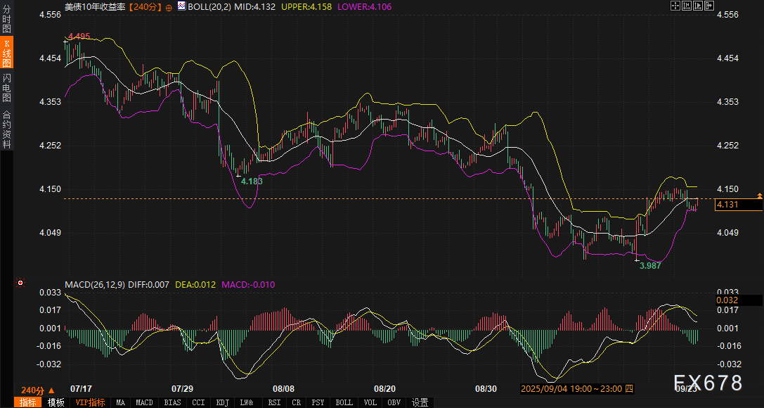 从240分钟图表观察,10年期美债收益率自8月20日高点4.353%以来的回调已趋于尾声,9月16日探底4.099%后,价格逐步企稳并反弹至4.131%,这轮修复性上涨虽未改写整体下行通道,但已将动能从空头主导转向多空拉锯。移动平均收敛与发散指标(MACD)双线在零轴附近黏合,DIFF线值为0.007、DEA线值为0.012,柱状图收缩至-0.010,显示多空力量趋于平衡,短期波动率正在消退。布林带通道的收窄进一步强化了这一信号,中轨位4.132%已成为当前锚点,价格正紧贴其下方运行,这往往预示市场即将酝酿方向性突破。