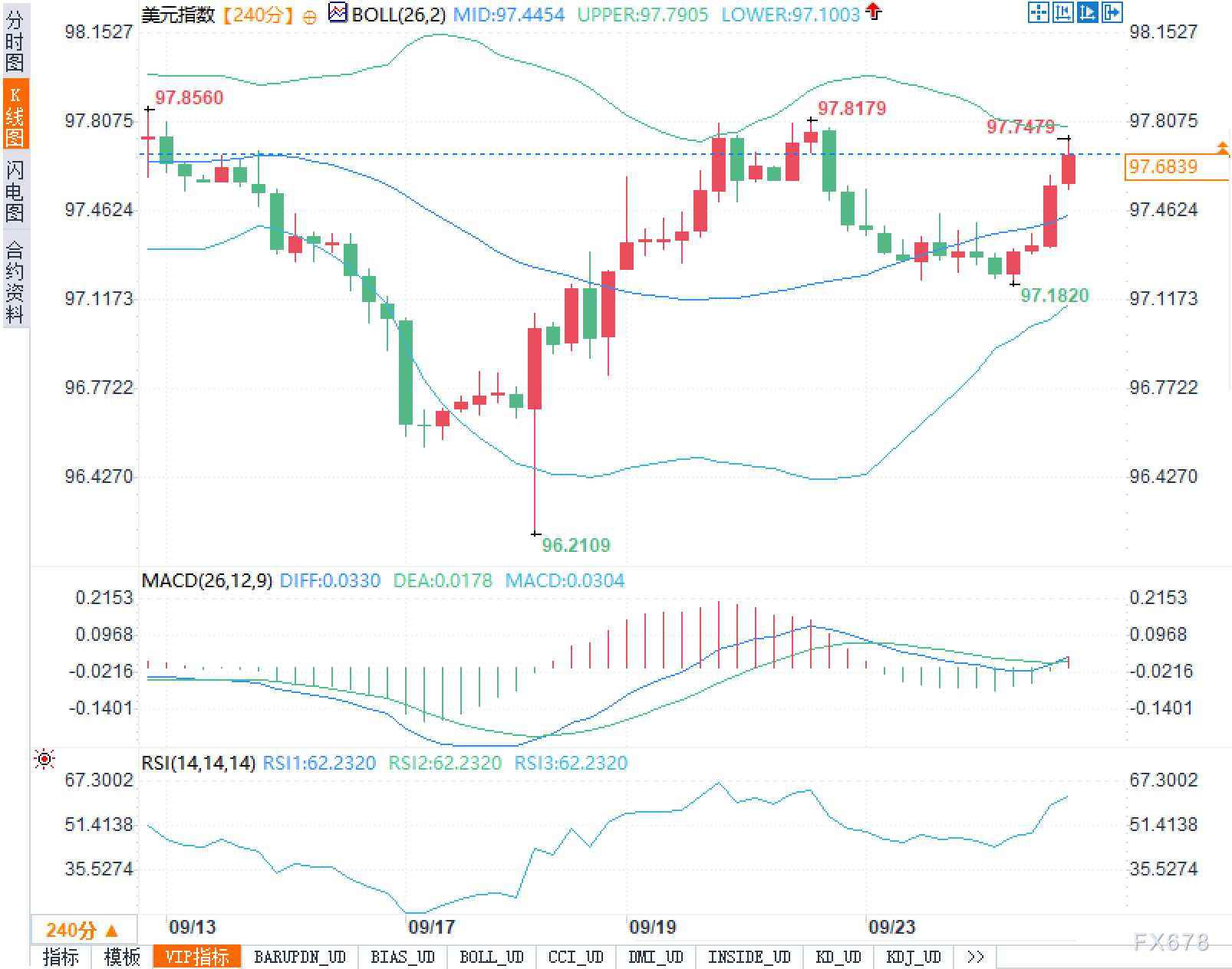 四小时K线(240分)显示,布林带上中下轨分别位于97.7905/97.4454/97.1003,价格当前运行在布林中轨之上、逼近上轨,表明短线偏强但面临轨道压制。自9月中旬触发的长下影反抽(低点96.2109)之后,价格在97.1820附近构筑了更高的台阶,再度上攻至97.7479与97.8179一带形成双重阻力区。