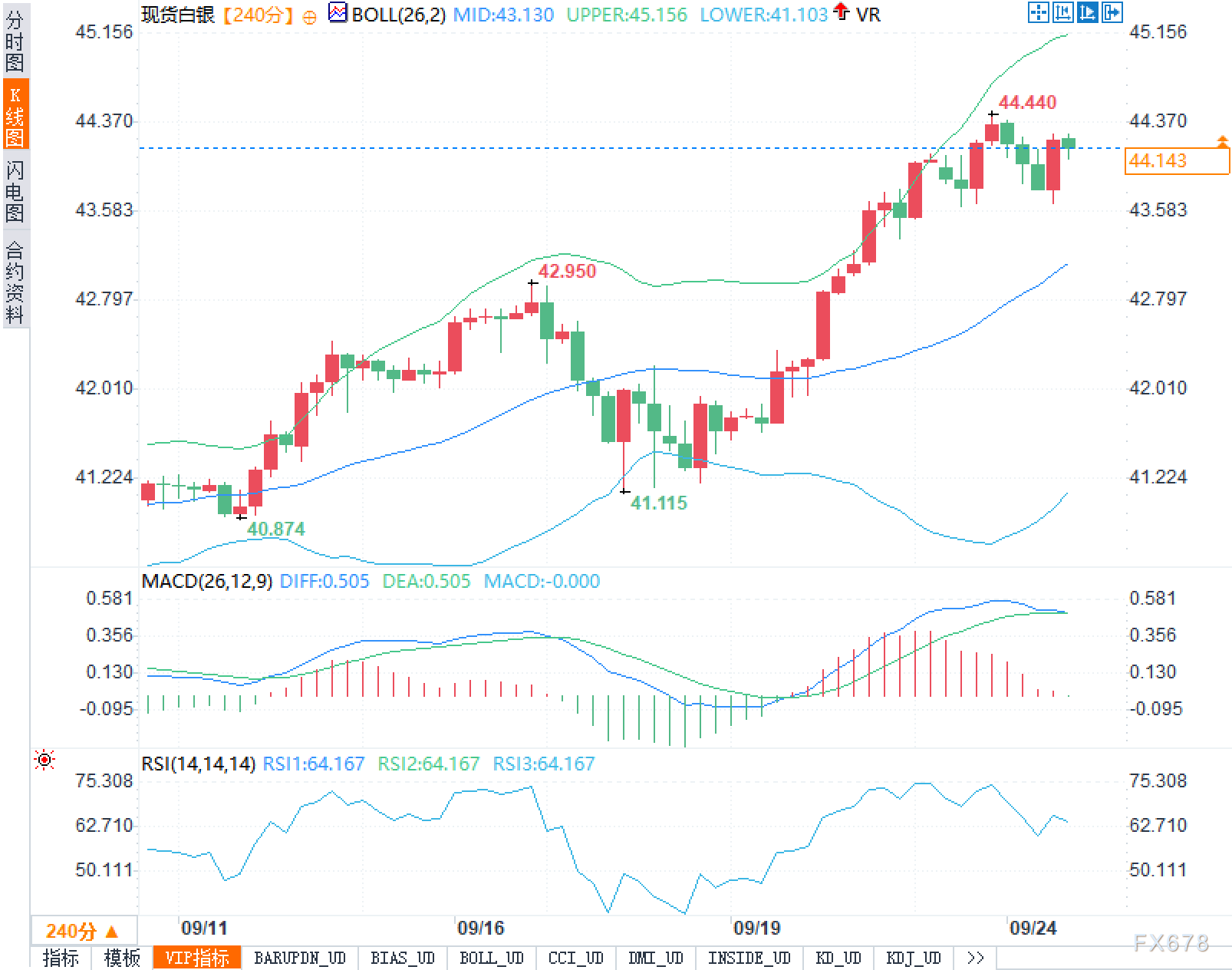 近期白银上冲至44.440后,盘面转入高位横向博弈: